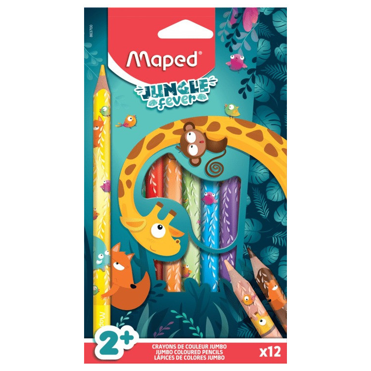 Les bébés découvrent les couleurs avec les crayons Jungle Fever Les bébés découvrent le dessin et le coloriage avec les crayons de couleur Jungle Fever. Parfaits pour les artistes en herbe, ces 12 gros crayons aux couleurs vives et éclatantes ouvrent les portes de la création à vos enfants. Des illustrations ludiques sur le thème de la jungle et des animaux sauvages décorent chaque crayon. Pour le plus grand plaisir des enfants !Conçus pour encourager les bébés dans leurs premiers pas dans le monde du dessin, les crayons de couleur Jumbo Jungle Fever sont loutil idéal pour les premiers dessins des jeunes enfants, dès lâge de 2 ans.Des crayons de couleur pensés pour les petites mains Les gros crayons de couleur Jumbo Jungle Fever sont spécialement adaptés aux besoins des tout-petits. Avec leur forme triangulaire unique, ils assurent une prise en main aisée et confortable. Leur gros diamètre « Jumbo » est parfaitement adapté aux mains des jeunes enfants, et leur permet de colorier en toute simplicité.La mine large et résistante, dun diamètre de 5 mm, garantit une utilisation prolongée et un rendu des couleurs vif et couvrant, idéal pour les artistes en devenir. Fabriqués principalement à partir de résine, les crayons de couleur Jungle Fever sont sans risque déchardes et très facile à tailler.Conformes à la réglementation des jouets, ils permettent à vos petits artistes de sexprimer librement et en toute sécurité. Avec les crayons de couleur Jumbo Jungle Fever, chaque dessin devient une aventure captivante et colorée !La collection Jungle Fever Avec la collection Jungle Fever, les enfants découvrent le coloriage, le dessin, le découpage, en toute sécurité. La gamme offre des produits sûrs, conforment à la réglementation des jouets. Les fournitures scolaires et le matériel de coloriage Jungle Fever sont adaptés aux petites mains des bébés dès 1 an. Ils peuvent ainsi les utiliser en toute simplicité. Les produits sont décorés de motifs inspirés de la jungle et danimaux sauvages trop mignons.Caractéristiques Pochette de 12 crayons de couleur Jungle Fever. Gros diamètre, format « Jumbo ». Crayons de couleur fabriqués avec 35% de matière recyclée et 22% de matière dorigine naturelle. Produit conforme à la réglementation des jouets. Dès 2 ans.