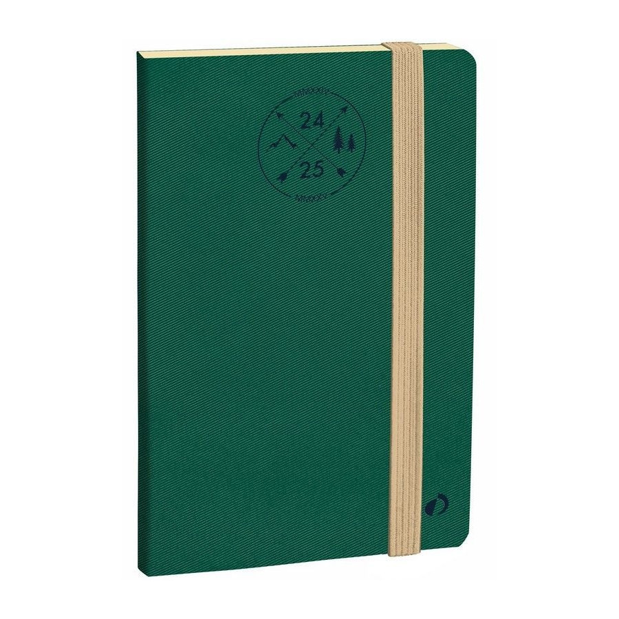 Calendrier : 1 semaine sur 2 pages. Modèle : 24 SD. Format : 160 x 240 mm. Période : Du 09/2024 à 12/2025 - 16 mois. Couverture Everest, souple au toucher tissé, avec marquage en creux. Couleur de la couverture : Vert Forêt. Fermeture par élastique de couleur. Avec pochette à soufflet et page de garde personnalisable. Papier ivoire. Reliure cousue. Édition multilingue avec atlas couleur intégré.