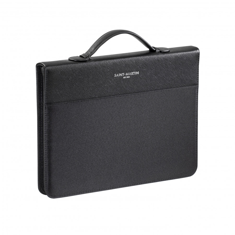 PORTFOLIO A4 NOIR SACHA - SAINT-MARTINDimensions : 26.5X36.5X3.5CM Fermeture zippée avec curseur en métal gun metal. Curseur embossé avec le logo "SAINT-MARTIN Est.1949". Extérieur en bi-matière: bande en polyuréthane (PU) saffiano noir et le reste en microfibre. Poignée ajustable sur la tranche en PU saffiano noir. Logo "SAINT-MARTIN Est.1949" embossé en argenté sur le devant du portfolio. Intérieur en tissu polyester effet coton. 4 emplacements pour cartes de visite 2 porte-stylos. 1 compartiment à soufflet renforcé cartonné pour ordinateur 13 pouces maximum. 1 grande poche plaquée pour les documents papier. 1 emplacement pour y glisser un bloc-notes papier. Biais en polyester Surpiqûres ton sur ton noires. Coloris : Noir