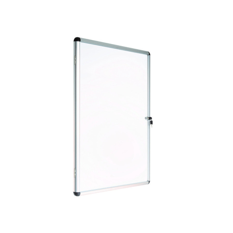 Vitrine réalisée en aluminium extrudé, légère et facile à installer avec surface métallique peinte et porte abattante en polymère acrylique pour une grande visibilité. Livrée avec 2 clés universelles et kit pour fixation murale.