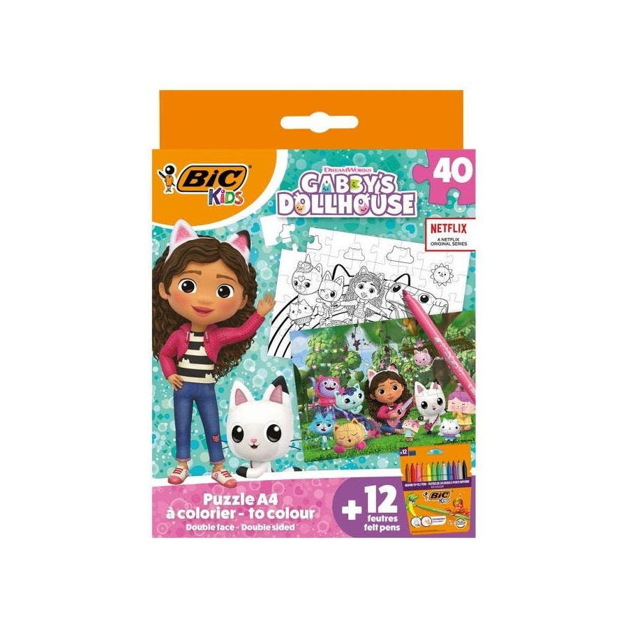 Découvrez l'univers enchanté de Gabby et la Maison Magique avec ce coffret créatif signé BIC Kids ! Ce set combine amusement et expression artistique pour les enfants dès 4 ans, en proposant un puzzle de 40 pièces double face et 12 feutres de coloriage ultra-lavables.Le puzzle présente :Une face colorée illustrant Gabby et ses Gabbychats dans leur univers magique.Une face en noir et blanc à personnaliser avec les feutres inclus.Les 12 feutres BIC Kids Kid Couleur sont spécialement conçus pour le quotidien des enfants :Pointe moyenne bloquée pour éviter l'enfoncement sous pression.Encre à base d'eau ultra-lavable sur la peau et la plupart des tissus.Couleurs vives et lumineuses pour stimuler la créativité.Pratique, le coffret cartonné permet de ranger puzzle et feutres après chaque utilisation, favorisant l'organisation et la durabilité du jeu. Ce coffret est parfait pour développer l'adresse, la créativité et l'imagination des jeunes artistes tout en s'amusant.