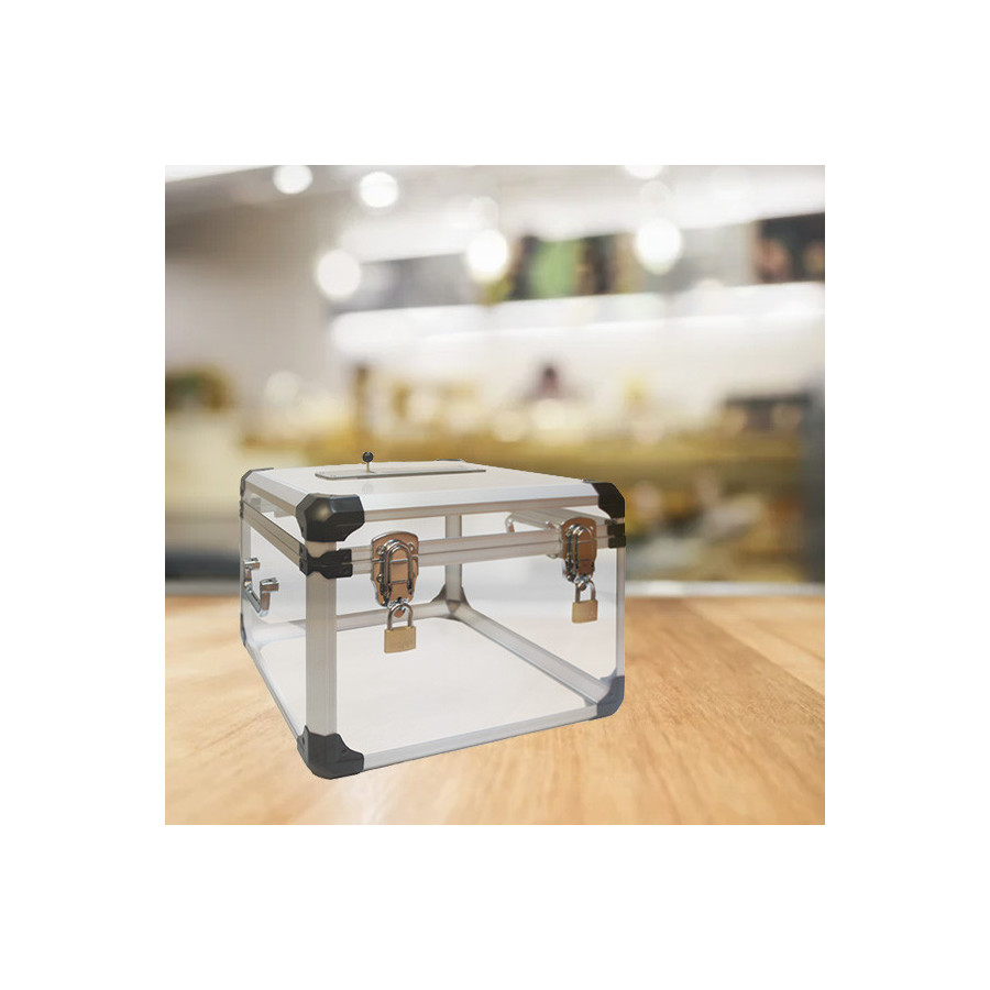Urne électorale transparente en plexiglass avec ossature aluminium, capacité 1300 bulletins. Trappe avec compteur automatique, 2 cadenas de sécurité à clés différentes, poignées rabattables pour transport. Conforme aux normes pour bureaux de vote.